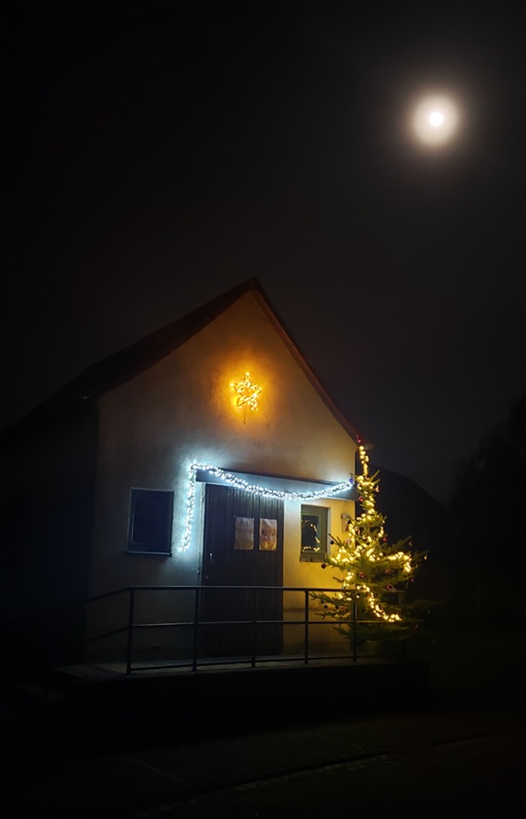 Weihnachtlich geschmücktes und beleuchtetes Milchhäuschen in Großpötzschau